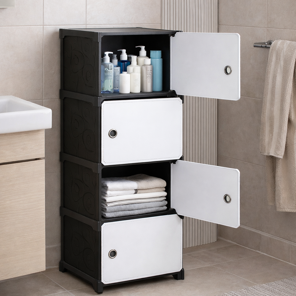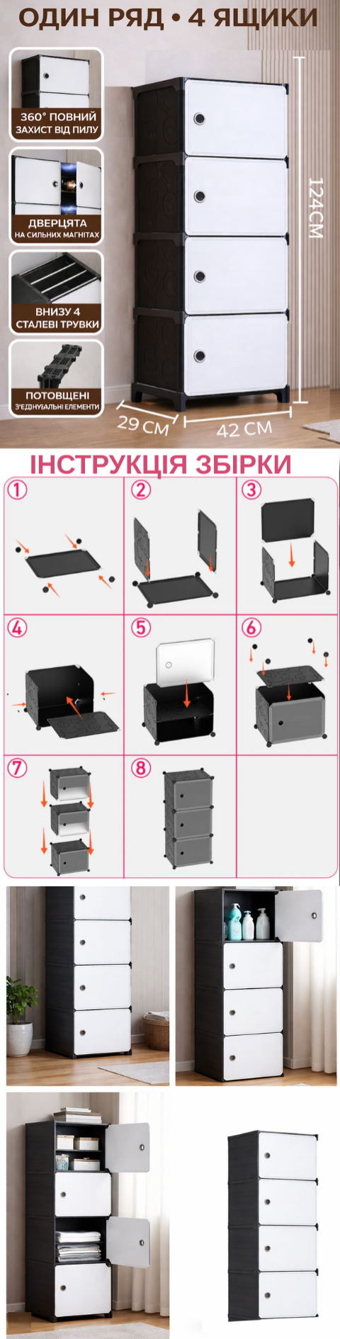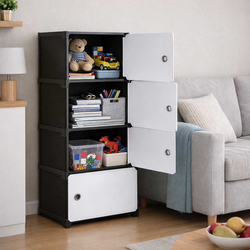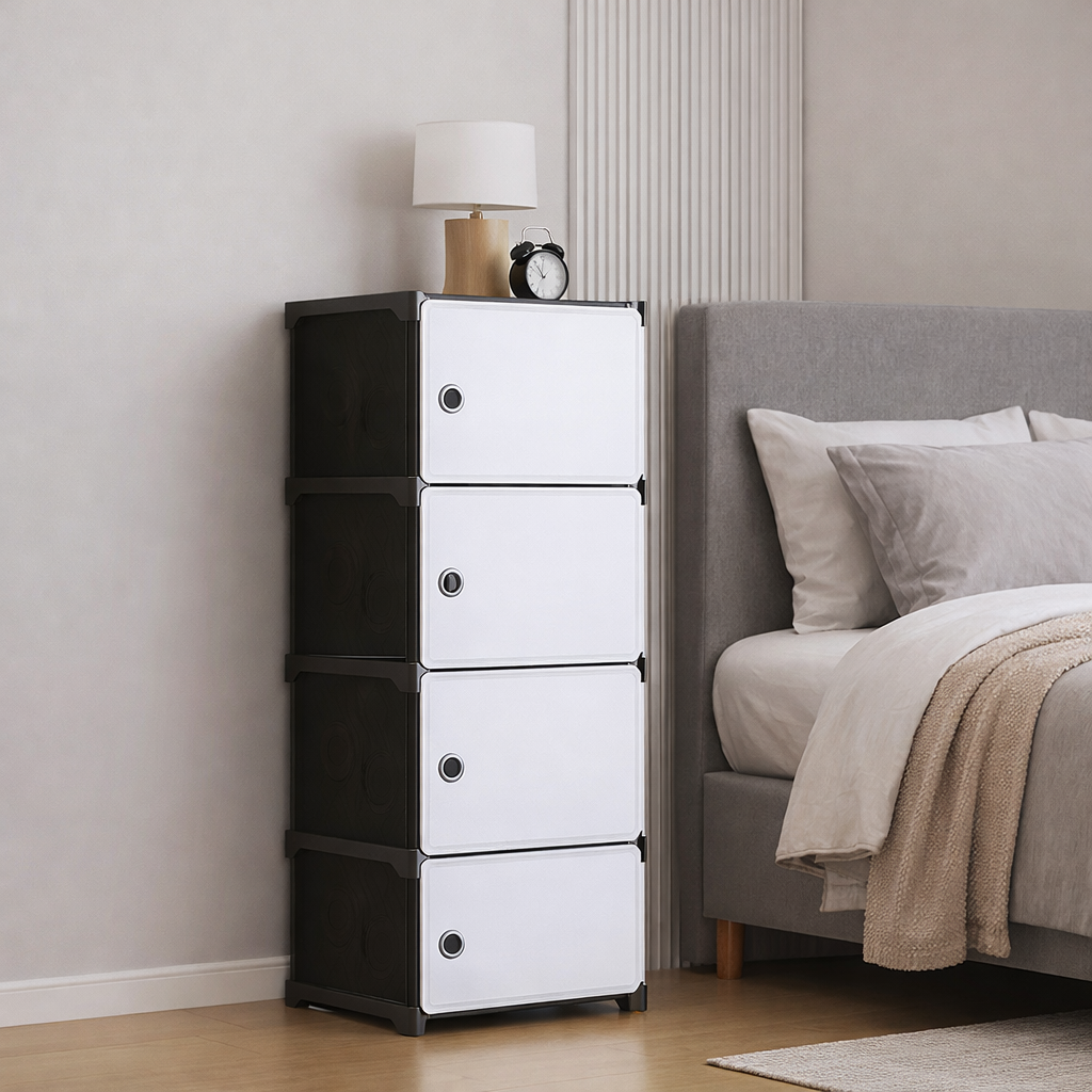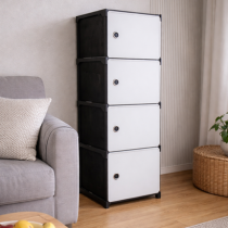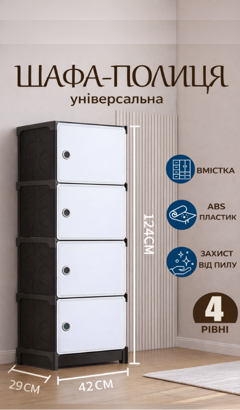 Пластиковий шафа-комод 8104 на 4 секції — це сучасне та практичне рішення для організації зберігання взуття, одягу, аксесуарів, іграшок або побутових речей. Завдяки модульній розбірній конструкції шафа легко збирається, переміщується та адаптується під ваш простір.